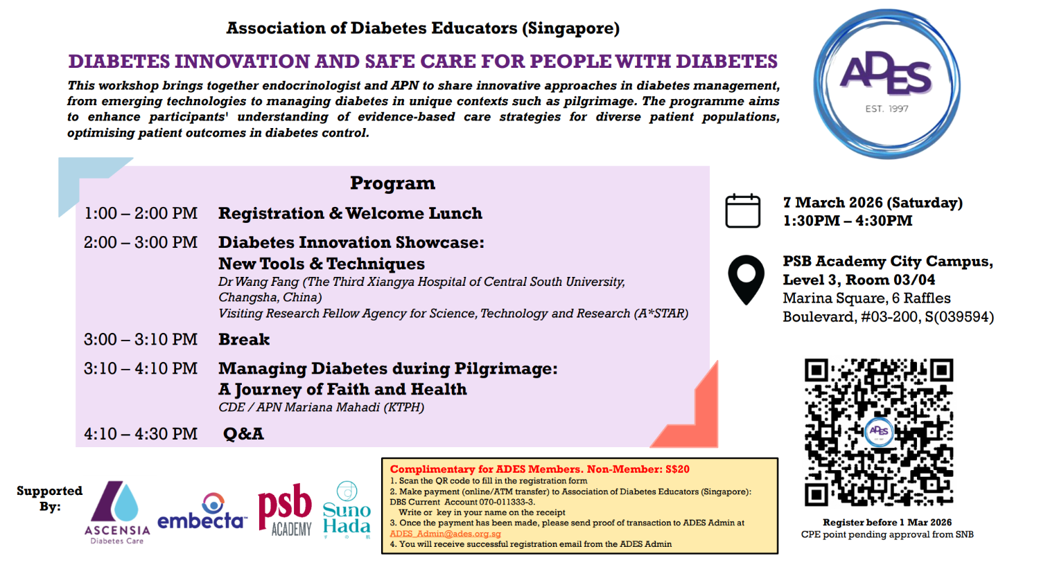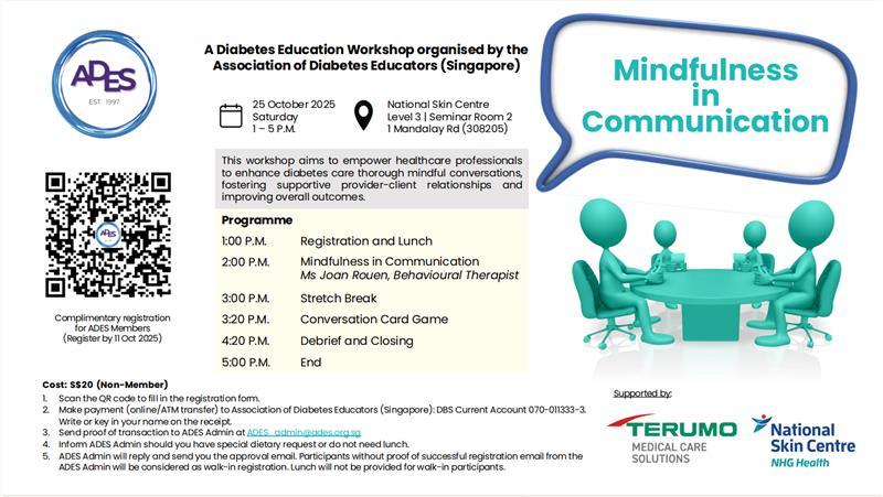 Join us at various seminars and workshops to keep abreast with latest updates on diabetes education and management. Volunteer at outreach events to promote optimal health and well-being of people with diabetes through education and counselling.